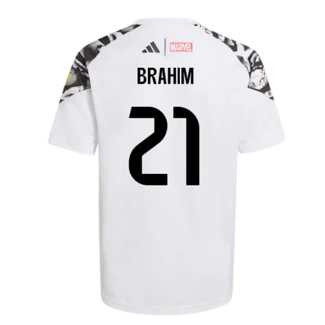 Official Brahim Diaz football shirt. This is the NEW Real Madrid Marvel Avengers Training Shirt (White) - Kids for the 2025-2026 season which is manufactured by Adidas and is available in all Childrens sizes.