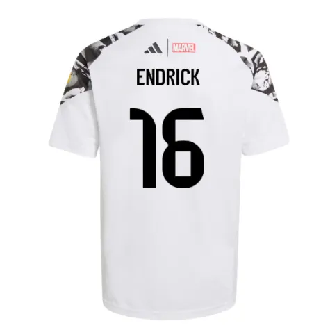 Official Endrick football shirt. This is the NEW Real Madrid Marvel Avengers Training Shirt (White) - Kids for the 2025-2026 season which is manufactured by Adidas and is available in all Childrens sizes.