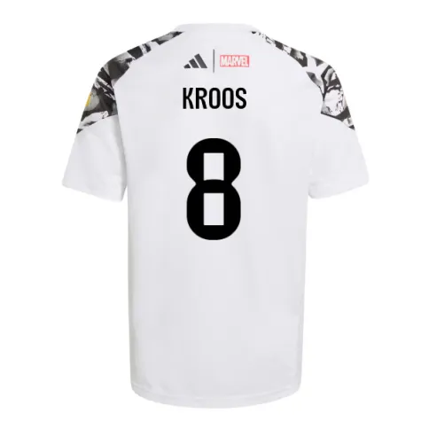 Official Toni Kroos football shirt. This is the NEW Real Madrid Marvel Avengers Training Shirt (White) - Kids for the 2025-2026 season which is manufactured by Adidas and is available in all Childrens sizes.